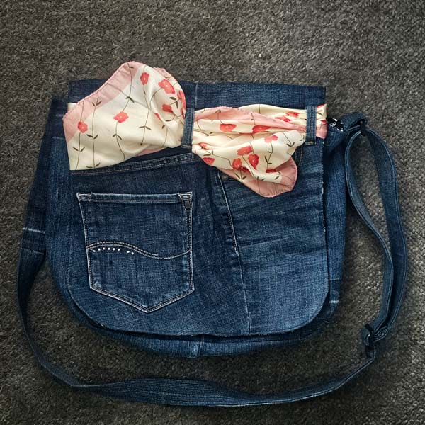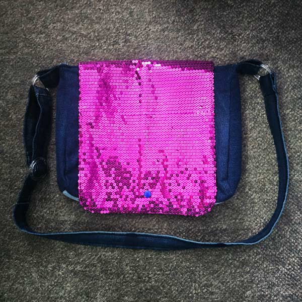 This bag, also made from old jeans, was based off the same satchel that recently fell apart on me. The most notable feature is the hot pink sequins flap, but the inside also sports 2 large pockets for items like drink containers and a zipper pocket.