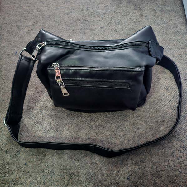 This bag was recycled from a different bag. It was old and falling apart in certain areas. On the outside, there are 3 zipper pockets, 2 on the front (see image) and one on the back. Inside the main compartment is another zipper pocket.